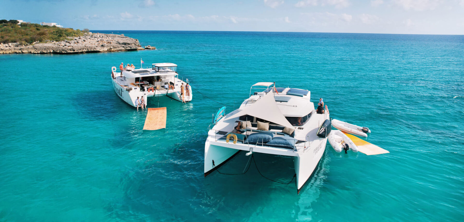 Drone view of a motor catamaran anchored near Scrub Island, in Anguilla, during a boat charter in Anguilla