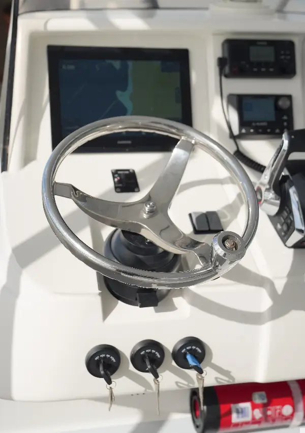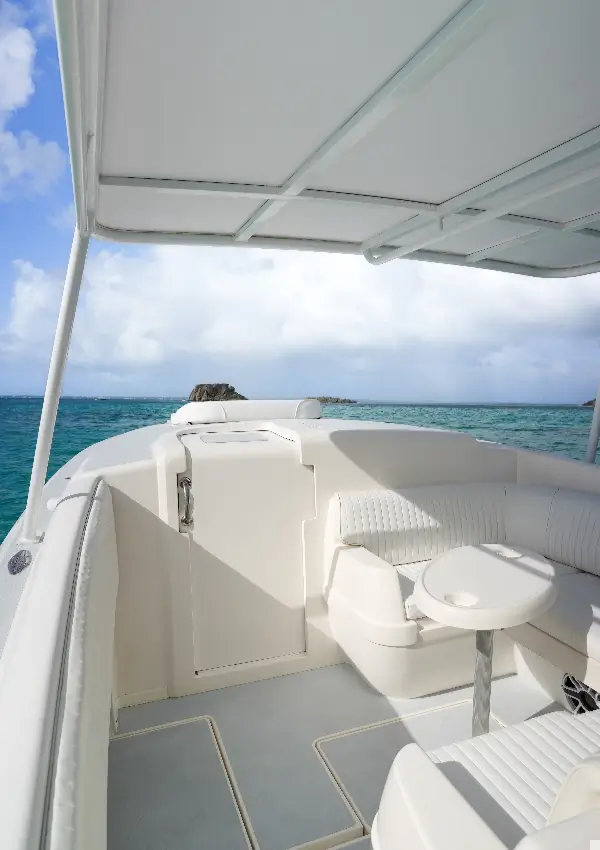 At the heart of the boat, a shaded outdoor seating area with a table provides a comfortable space to enjoy drinks, light meals, or simply take in the views. The large hardtop offers excellent sun protection, while the exterior bar with integrated cooler and multiple drink holders ensure refreshments are always within easy reach.