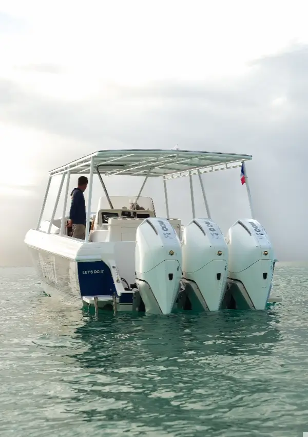 Powered by triple Mercury Verado 300 engines, this 37-ft speedboat delivers both performance and stability, cruising comfortably at 20–25 knots and reaching speeds of up to 35 knots, making island hopping fast, smooth, and exhilarating.